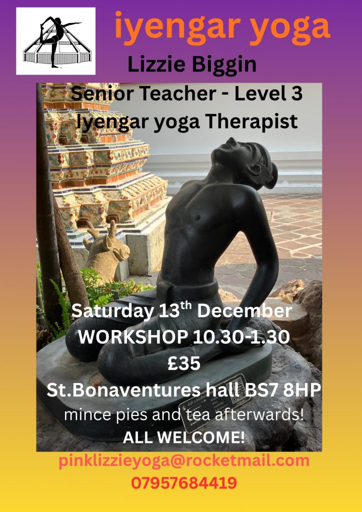 It will have a lot of restorative in it. You will need to bring full Iyengar kit and blankets and bolsters if you have them. There is parking on site so no problem with the Bristol parking as elsewhere!
